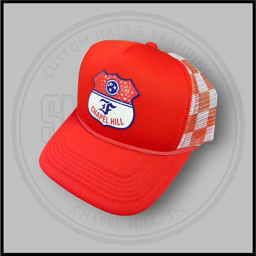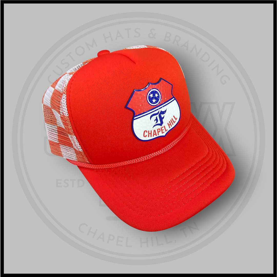 The "Chapel Hill Shield Dimples" Foam Trucker in Red Checker Mesh is a love letter to small-town roots and big-time heart. With our signature “Small Town Pride” patch front and center, this hat’s got sass, soul, and a whole lotta Southern sparkle.