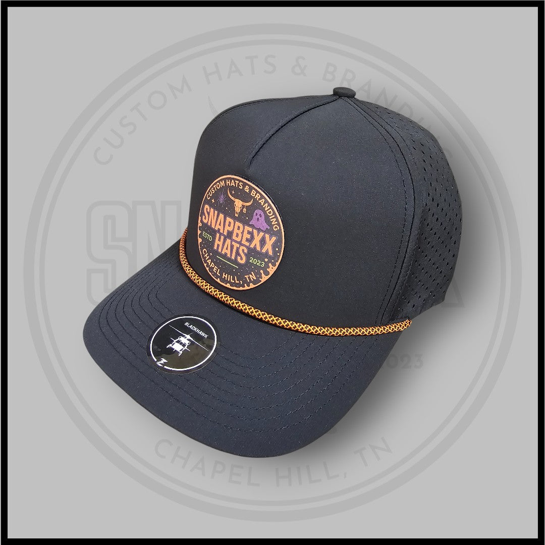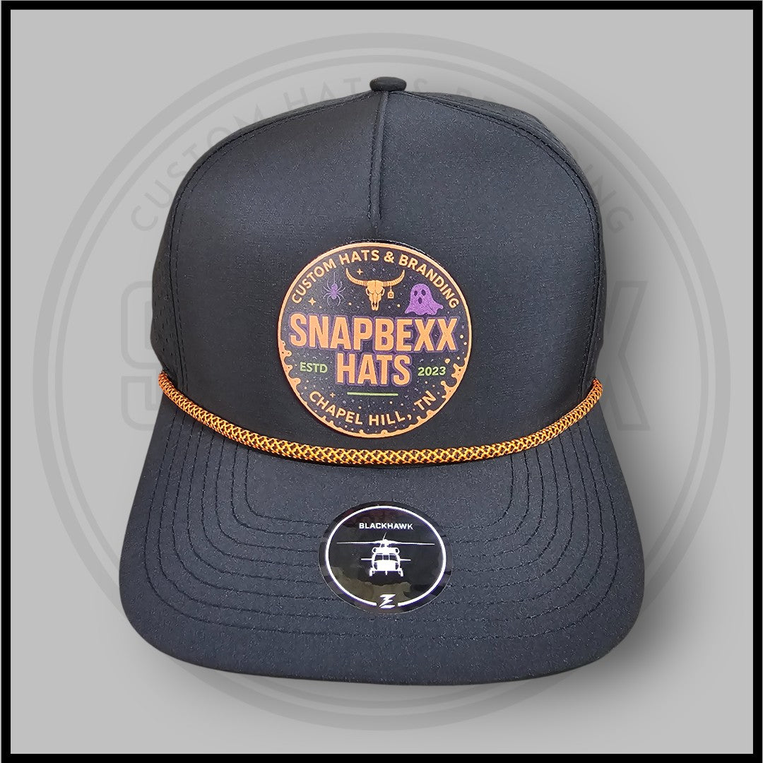 Built on a Zapped Headwear Blackhawk in Black with an Orange chainlink rope, this hat features our exclusive Haunted Heat Snapbexx patch — a spooky spin on our signature round logo. The ghost, longhorn, and neon orange details light it up like Halloween under stadium lights.