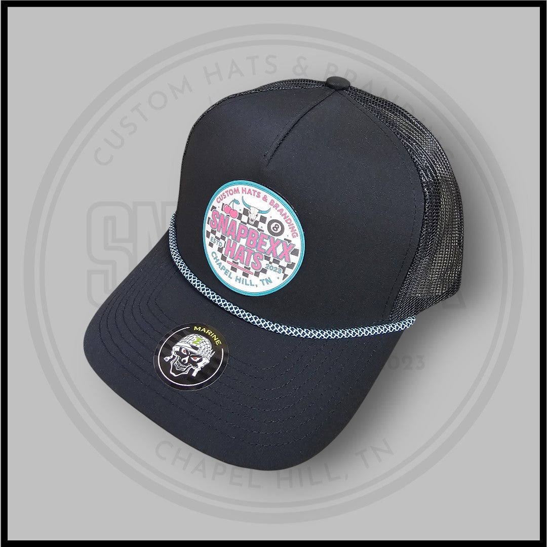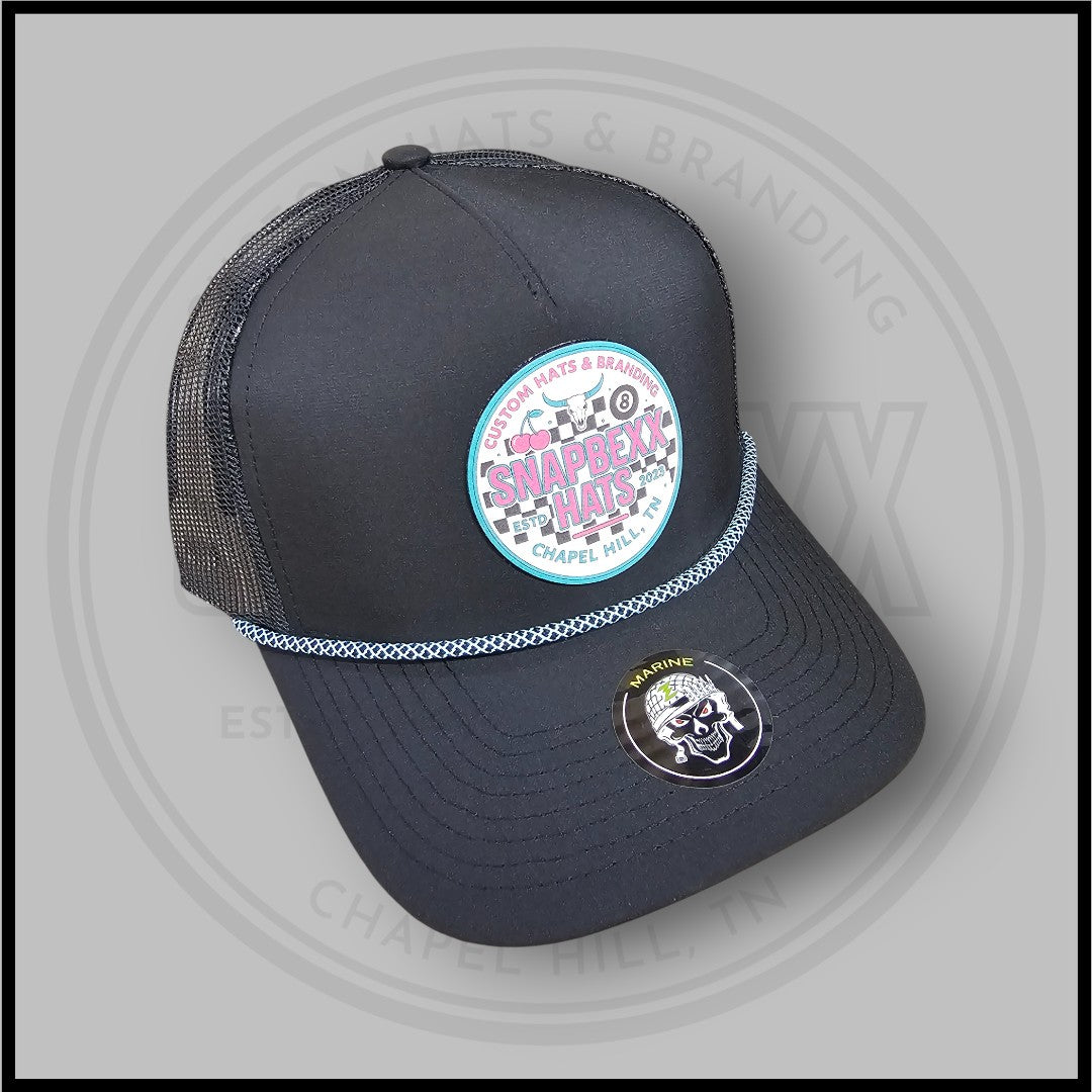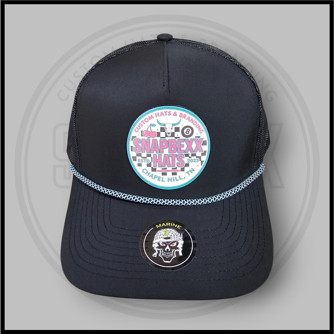 Built on a Zapped Headwear Marine R+ in Black with a Light Blue chainlink rope, this hat features our exclusive Retro Revival Snapbexx patch - a bold throwback to our signature longhorn style with a wink of old-school sass. From checkers to cherries, this one brings vintage heat with modern edge.